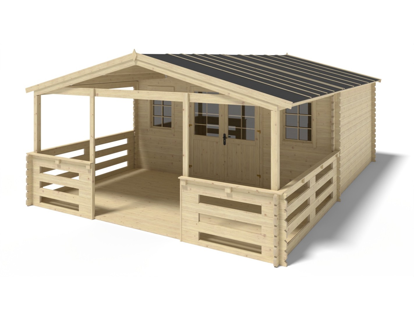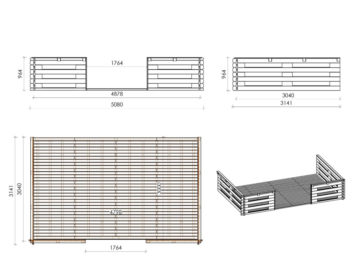Terraza de madera DOM616 de superficie 15 m2, ancho de 5 m y profundidad de 3 m. La terraza es compatible con las casetas con ancho frontal de 5 m y espesor de 40 mm, ofrecidas por ALTANKA p.s.a. Gracias a las instrucciones de montaje adjuntas, la instalación no causa mayores problemas.
